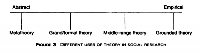 Theory 的种类: 1) metatheory,theory of theory. 一个指代着所有研究中最基础的假设以及哲学基础,说明/包括了 以上提到的 某某认知论是基于某某本体论 (interpretivist epistemology founded on an anti-foundationalist ontology)这样的元理论; 2)grand or formal theories, 提供了一个囊括了重点概念 原则的概念框架;3)middle range theory/substantive theories, 只是针对有限变量下的特定情势;4)practice/grounded theory 如下图: