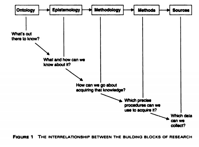 关于 ontological positions:体现的是研究者如何认知世界的本质 (如果给个横线来表示认知的话,这一头是realism,另一头是relativism,中间可能有structural,critical 等等的realism)。
